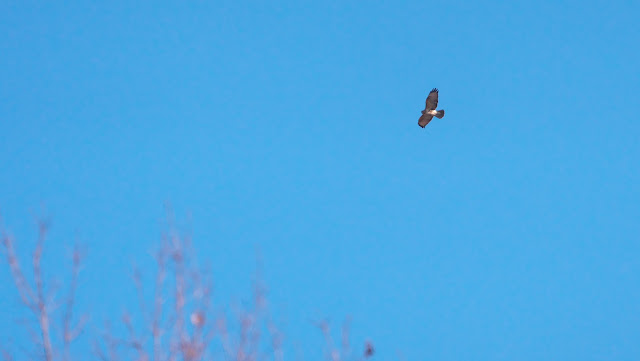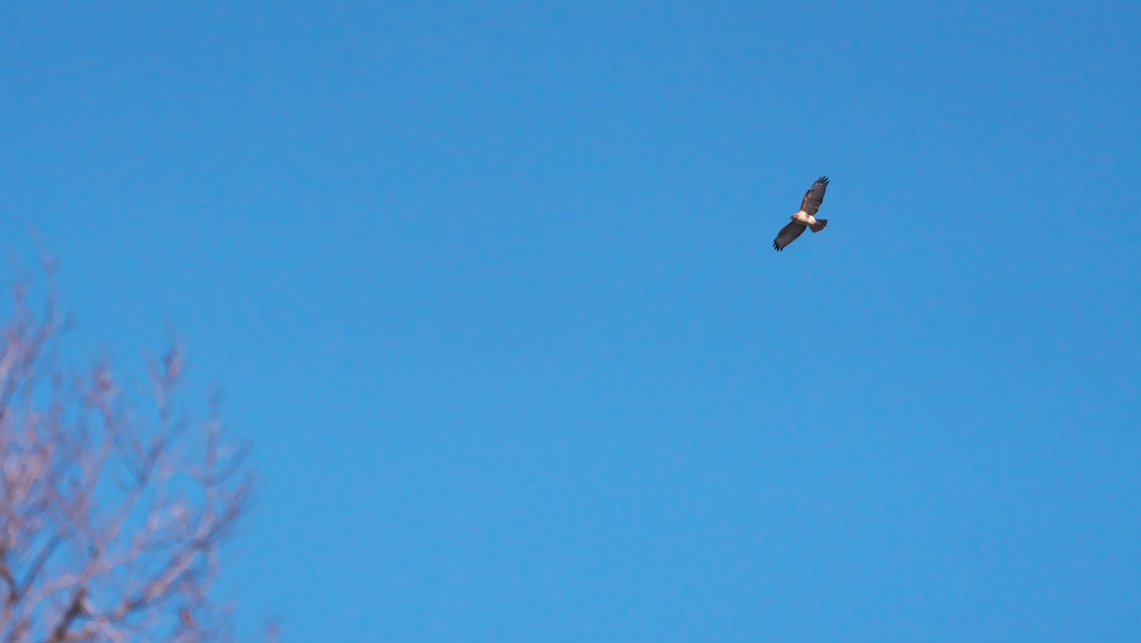 快晴の空にくるりと輪を描くとりさん。トンビ(とび)か?いえ、違います。尾羽の形が三味線のバチの形ではなく扇形ですね。これは、ノスリです。